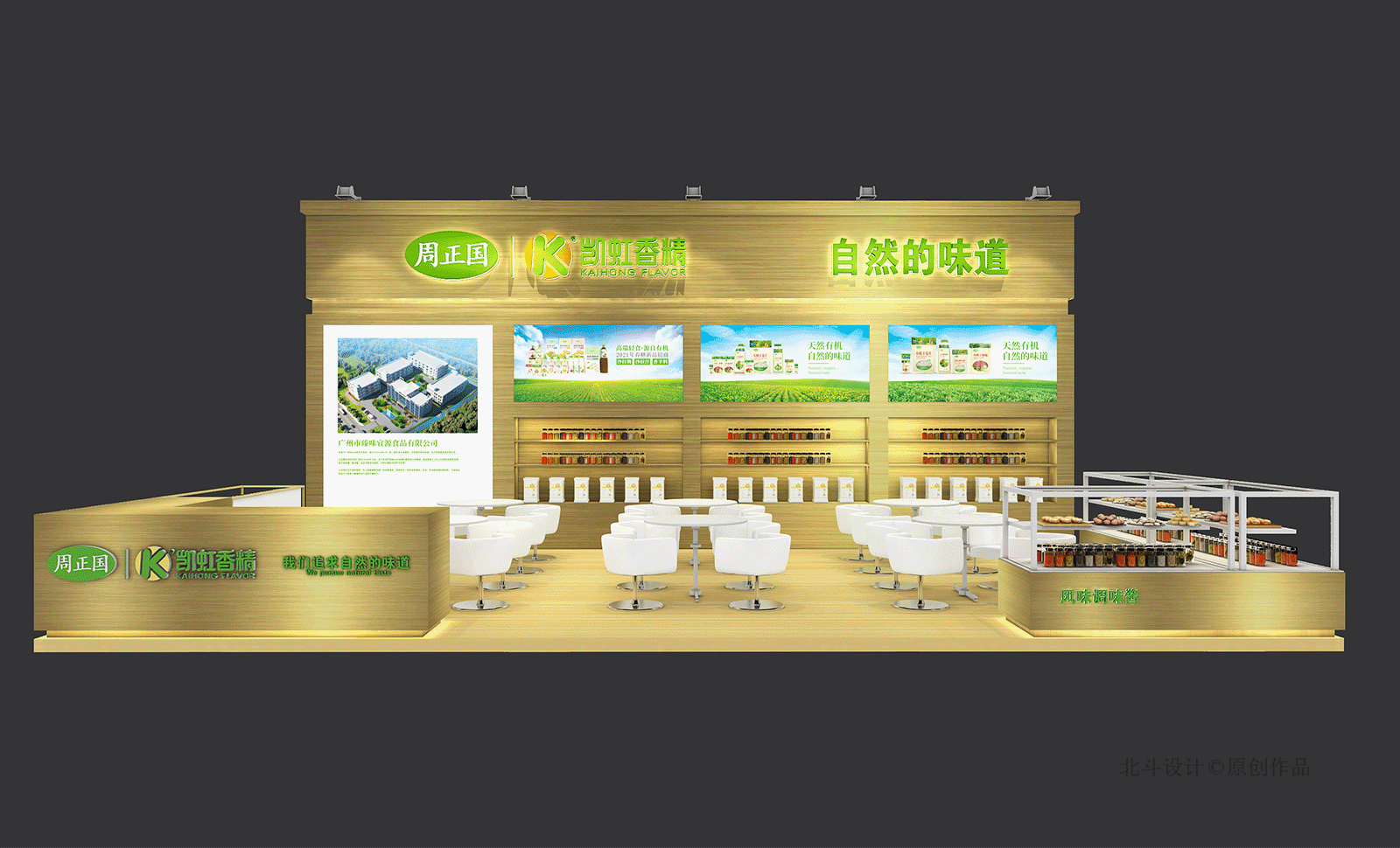 1. 展会空间风格设计,沿用企业的金色系,统一输出,展会追求效果:大开放,不过分封闭豪装,让参观者进出无需感觉到心理压力。