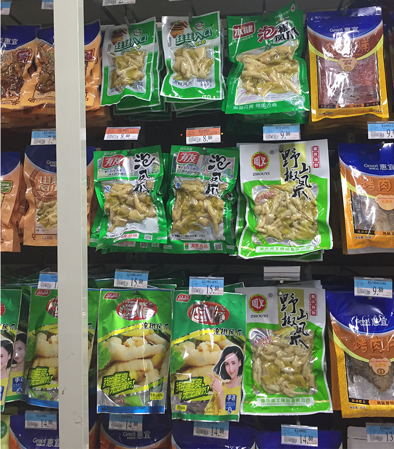 在中国,有很多企业喜欢走跟风路线,做一个擦边球的产品。比如下面的凤爪产品,第一推出市场的产品包装设计绿色的,那么接下来新的品牌为了能够夺得这一成熟市场的一杯羹,所以也纷纷推出同样风格的产品。很多时候,这样做第一就是为了能够扰乱市场,阻击对方品牌发展,第二,希望是能够借助对方教育成熟的市场带动自己的产品销售。但是这样的品牌视觉发展路线是不正确的。
